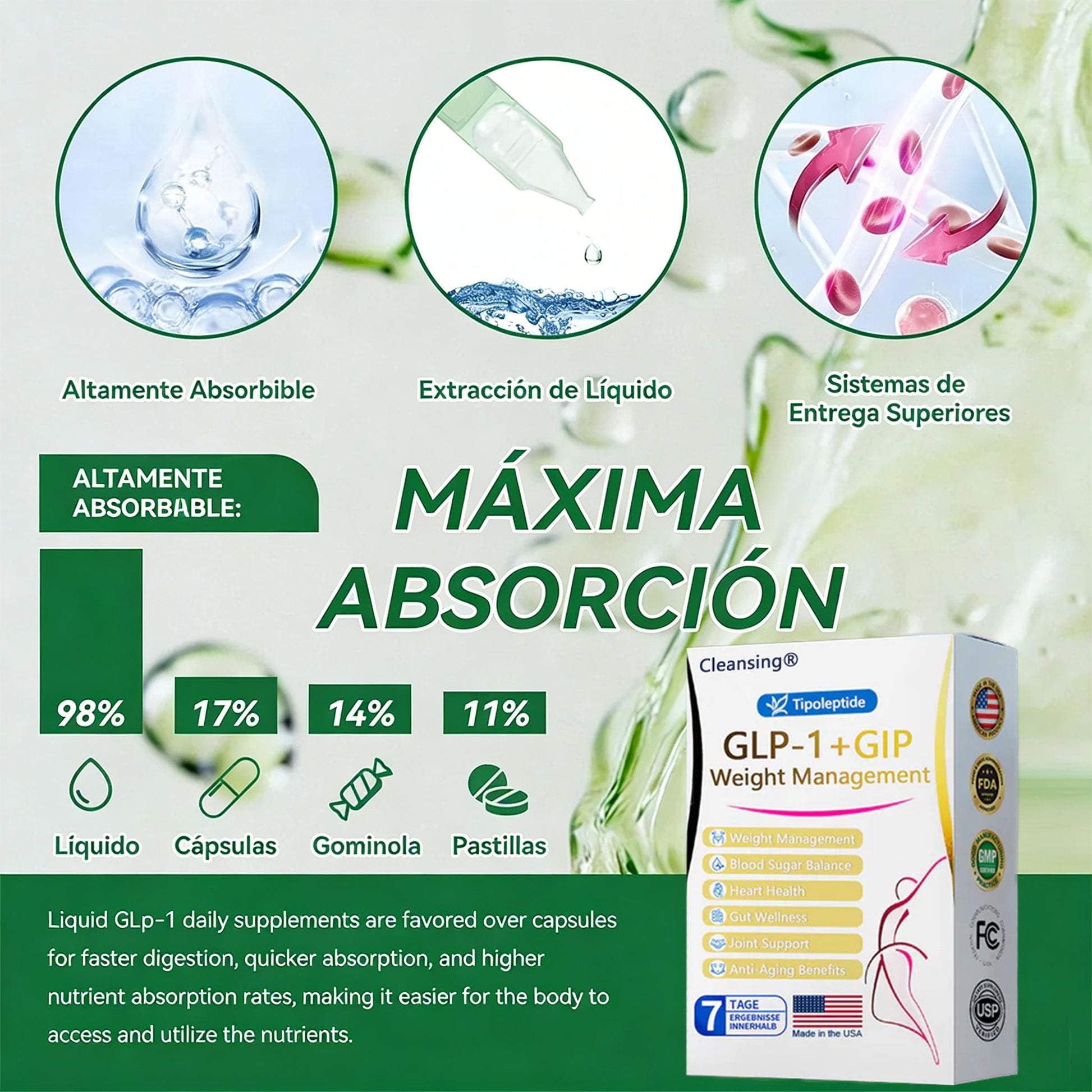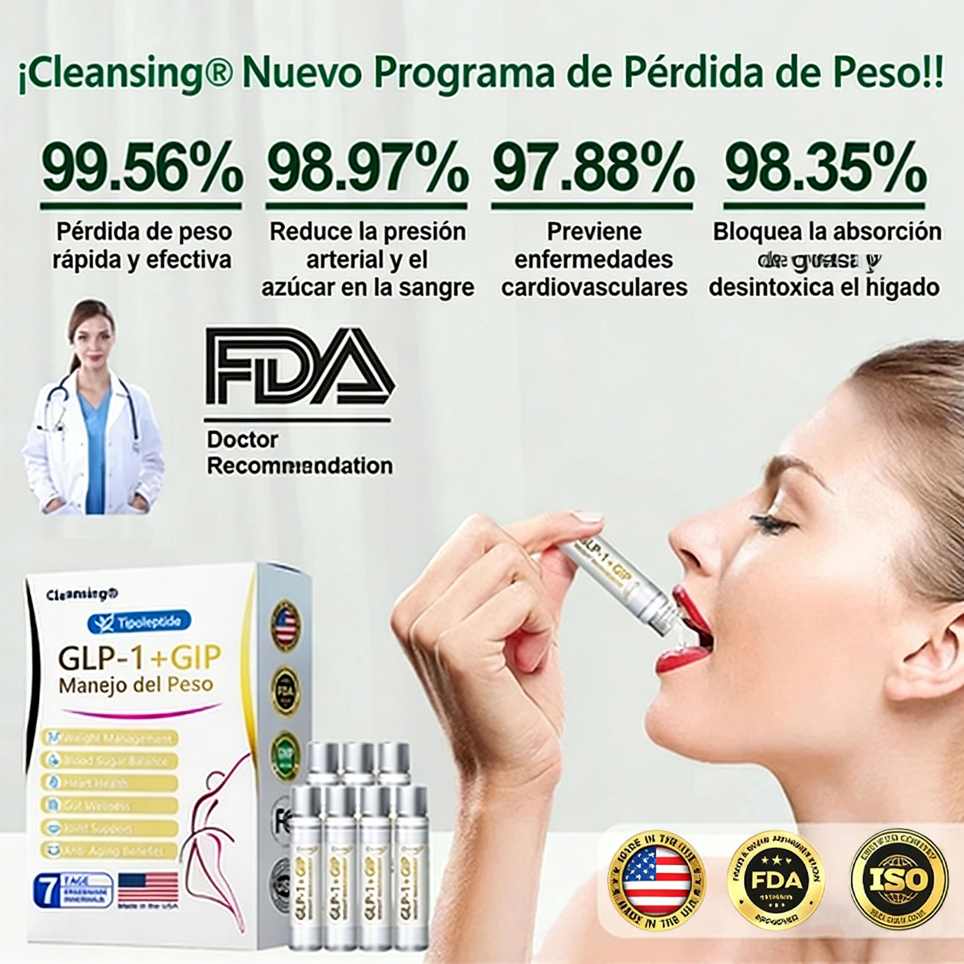 🍀 La solución oral Cleansing®, basada en la investigación innovadora de la tirzepatida (GLP-1 y GIP), ayuda a controlar el apetito, mejorar la eficiencia metabólica, optimizar la función cardiovascular y equilibrar la digestión. Estudios clínicos han demostrado que la activación dual de GLP-1 y GIP puede aumentar las tasas de éxito en la pérdida de peso hasta 2,5 veces en comparación con la dieta sola.
