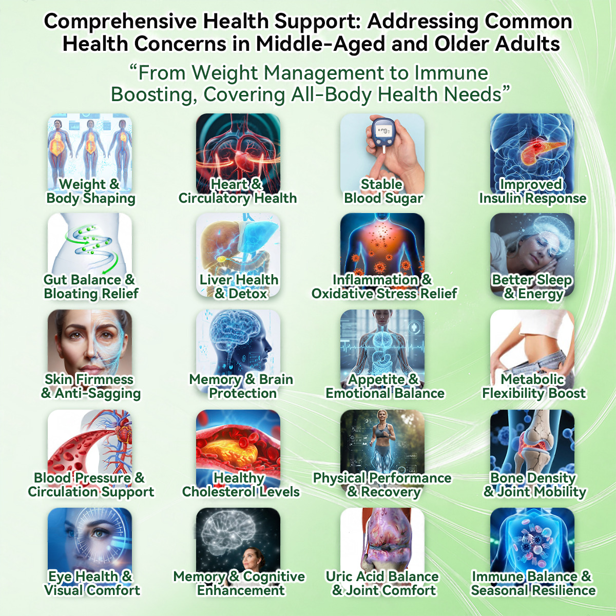 With aging, stress, and a fast-paced lifestyle, many people experience mood swings, anxiety, insomnia, memory decline, and brain fog from blood sugar fluctuations, inflammation, low energy, and nervous system overload. For women, menopause can further intensify hot flashes, mood instability, and poor sleep. To address this, key ingredients work together: Ashwagandha lowers stress hormones and improves sleep; Magnesium calms the nervous system; Omega-3 and Ginkgo Biloba protect neurons and boost focus; NAD+/NMN restore brain energy. Clinical data show that in 2–4 weeks, over 85% improved mood and sleep; in 4–6 weeks, about 80% saw better memory and less brain fog; and over 79% of women reported menopause symptom relief. Overall, this combination stabilizes mood, restores brainpower, and keeps the mind clear and focused.