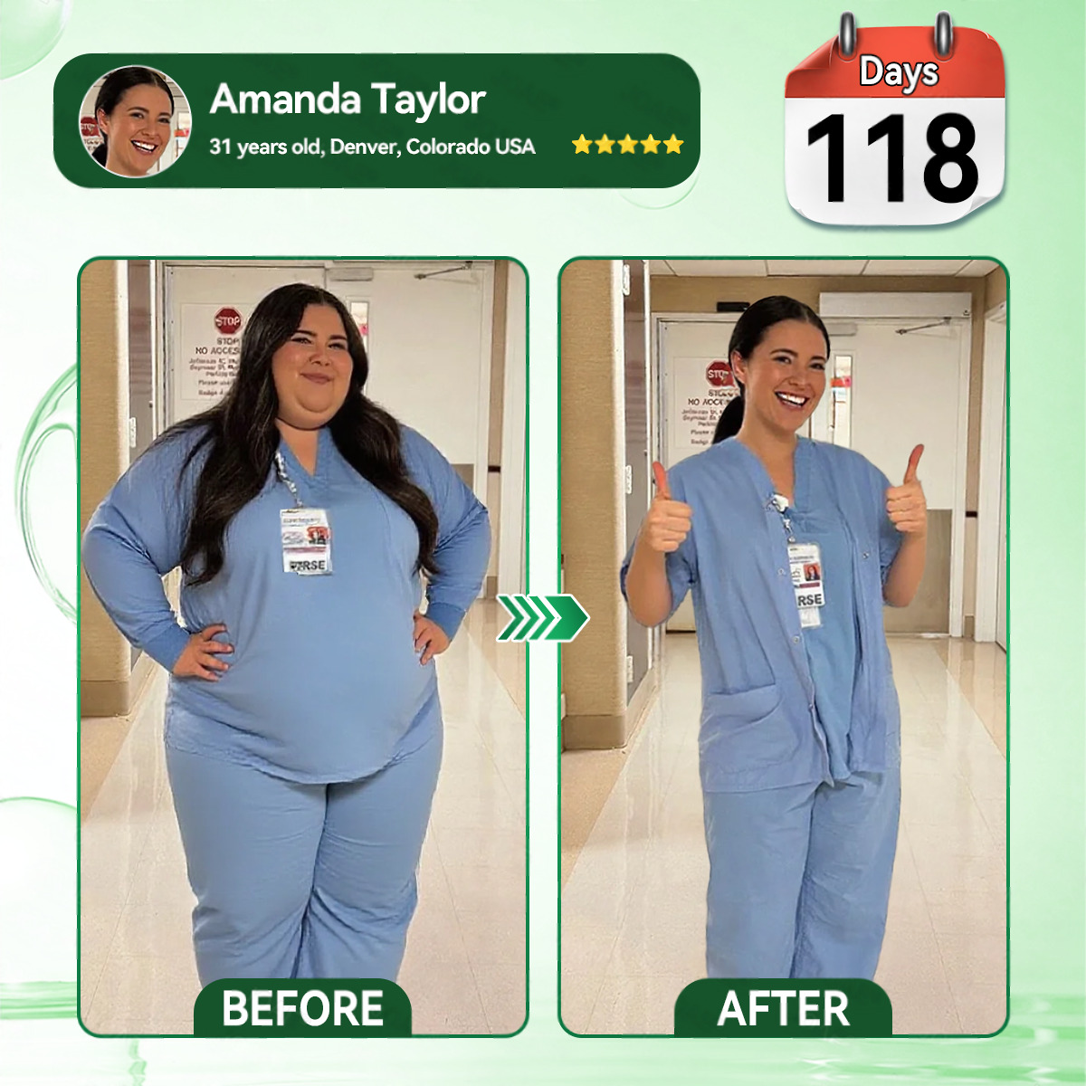 By month two, my energy was back. Started evening walks again. Four months later—170 pounds gone, down to 117. My skin didn't get all saggy and loose like you'd expect from such rapid weight loss. I'm actually pretty satisfied with how tight everything stayed. I'm still nursing, but now I take care of myself too. I tell my patients struggling with weight: it's never too late to get your health back." — Amanda Taylor, 31, Denver, Colorado